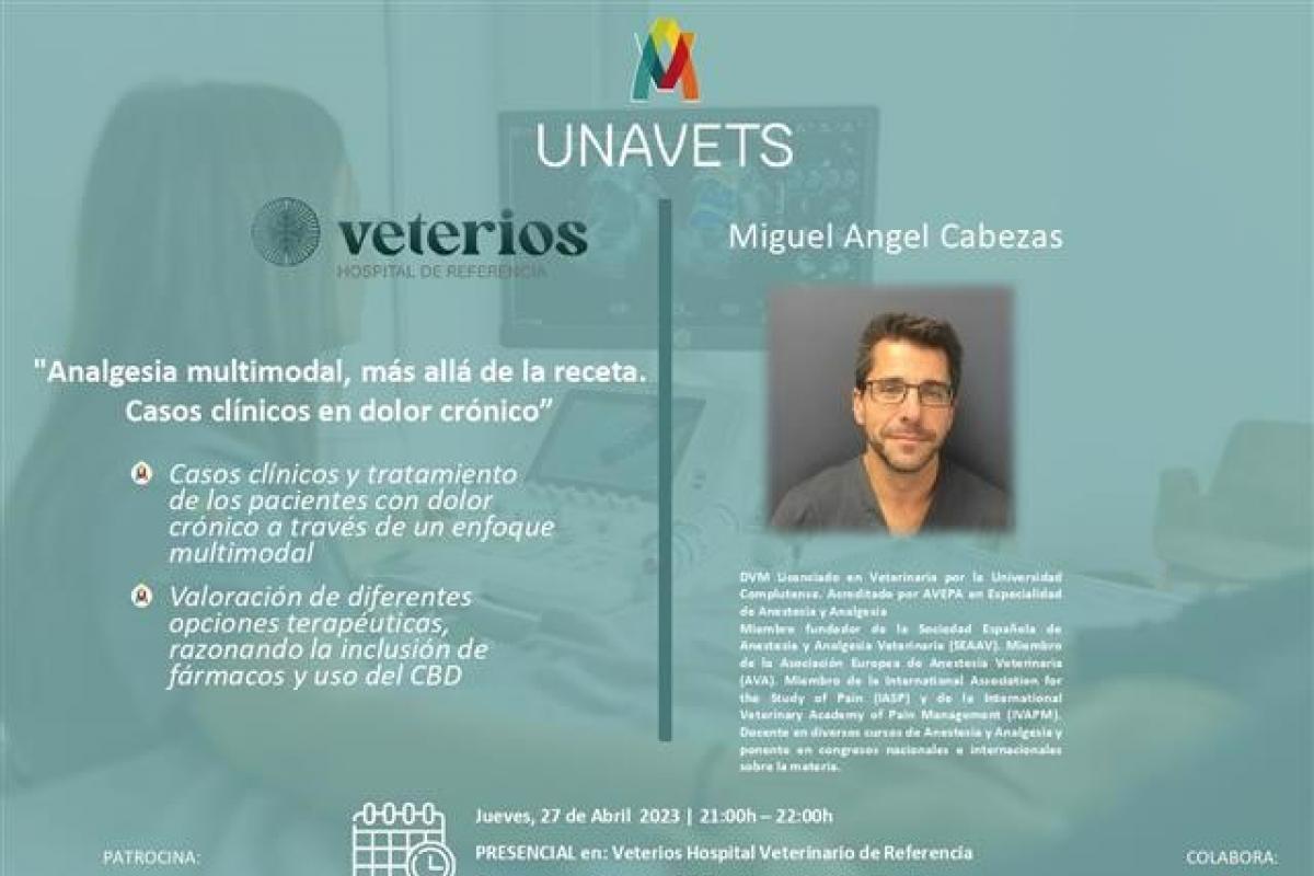 "Analgesia multimodal, más allá de la receta. Casos clínicos en dolor crónico" Impartida por Miguel Ángel Cabezas, DVM Licenciado en Veterinaria por la Universidad Complutense. Acreditado por AVEPA en Especialidad de Anestesia y Analgesia.