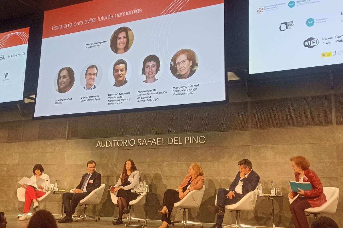 Así, en la mesa redonda organizada por la Fundación Vet+i bajo el título «Estrategias para evitar futuras pandemias» y moderada por la directora gerente de la misma, María Jaureguízar, intervinieron ponentes de referencia en nuestro campo aportando una visión interdisciplinar con representantes de la agencia reguladora, de la industria, de la investigación y de la administración pública como Cristina Muñoz, coordinadora del Plan Nacional de lucha frente a la Resistencia a los Antibióticos (PRAN) y jefa del Área de Preclínica y Clínica, centralizados de la Agencia Española de Medicamentos y Productos Sanitarios (AEMPS); César Carnicer, director general de Laboratorios Syva; Germán Cáceres, jefe del Área de Epidemiología de la Subdirección General de Sanidad e Higiene Animal y Trazabilidad del Ministerio de Agricultura, Pesca y Alimentación (MAPA); Noemí Sevilla, directora del Centro de Investigación en Sanidad Animal (CISA) del INIA-CSIC y Margarita del Val, senior scientist del Centro de Biología Molecular Severo Ochoa del Consejo Superior de Investigaciones Científicas (CBM-CSIC).