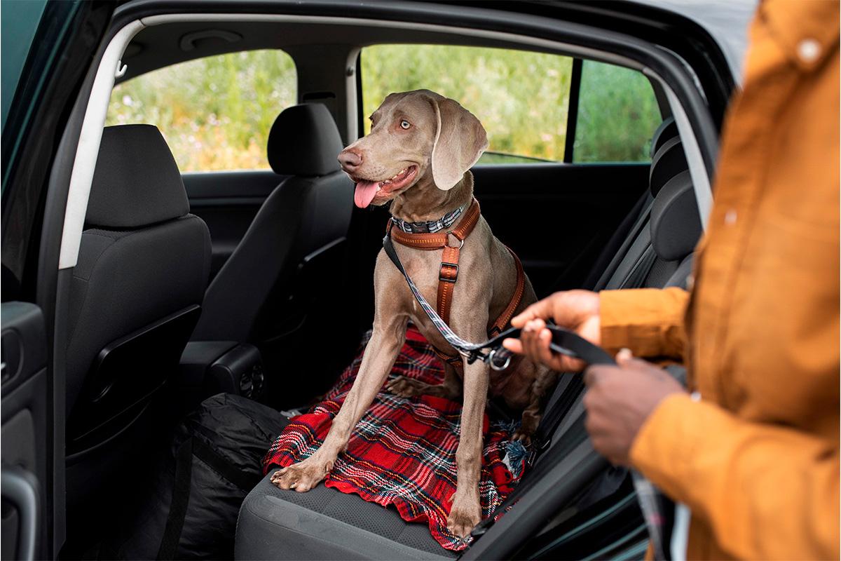El cinturón es obligatorio para todos. Y como el resto, los perros también deben ir bien asegurados y sujetos, ya sea en el maletero o en los asientos traseros. Ya sea en transportín o con un arnés que asegure todo su cuerpo, y en ningún caso con collar. Lo idóneo es un transportín duro y compacto y, a poder ser, en los asientos traseros. Si se trata de un perro pequeño, puede ir en un transportín de poco tamaño, colocado en el suelo. En caso de razas más grandes, pueden ir sujetos con un arnés de doble anclaje, unido a los enganches de dos cinturones de seguridad.