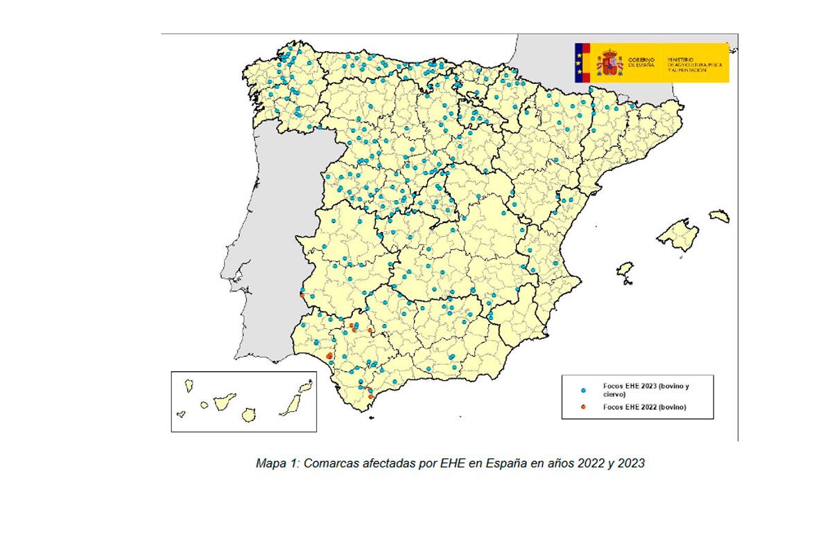 Desde la última actualización sobre la enfermedad realizada el pasado 15 de noviembre, el Laboratorio Central de Veterinaria (LCV) de Algete, laboratorio nacional de referencia para esta enfermedad, ha confirmado casos de enfermedad hemorrágica epizoótica (EHE) en 7 nuevas comarcas. De ellos, 6 se han detectado en explotaciones de bovino en las comarcas de: Medina de Pomar y Villadiegos (Burgos); Riaño (León); Piloña (Asturias); Cerdanya (Puigcerdá) (Girona); y Quinto (Zaragoza). Asimismo, se ha detectado 1 caso en ciervo en la comarca de La Ribera Alta-Alzira (Valencia).