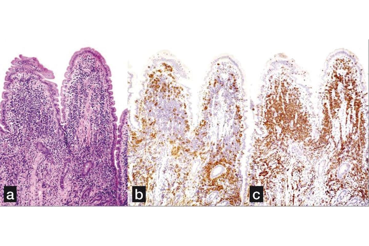 La intensidad de los signos clínicos es muy diferente de un animal a otro: problemas digestivos crónicos (diarrea o vómitos), disorexia y alteración del estado general. Estas manifestaciones pueden evolucionar "por crisis" durante meses, incluso años, antes de hacerse permanentes. En los estadios iniciales de la enfermedad, el vómito es el signo predominante siendo la expresión clínica de las lesiones intestinales, incluso de las más distales.